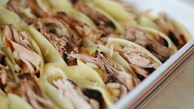 Pasta shells filled with delicious burrito ingredients like carnitas, rice, beans, and creamy cheese sauce.