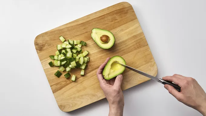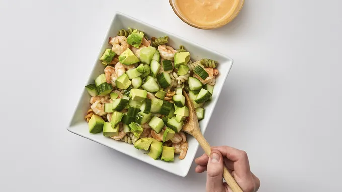 Step5To assemble the pasta salad, spoon the shrimp over the cooked Suddenly Salad™ pasta. Mix in the avocado and cucumber. Drizzle the spicy mayonnaise atop.