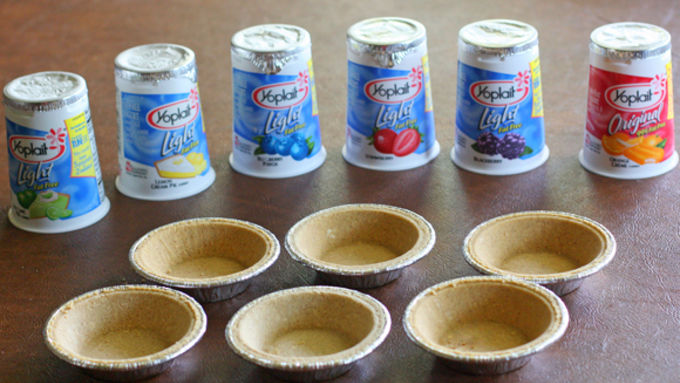Step1Fill each graham cracker crust with one of the Yoplait yogurts. Garnish with fruit pieces right before serving.