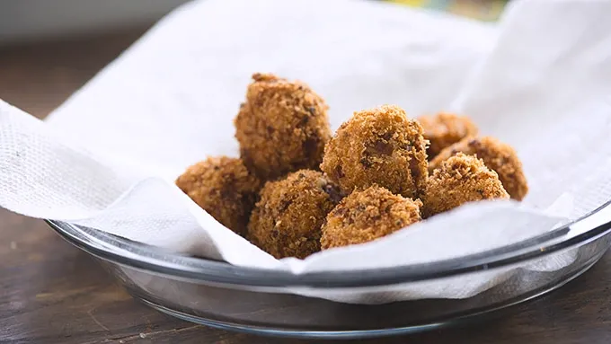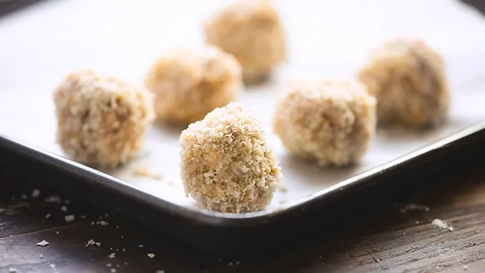 Use your hands to press the mixture into small balls about the size of a golf ball. Roll each ball through the flour, then the beaten eggs, and finally in the panko breadcrumbs.