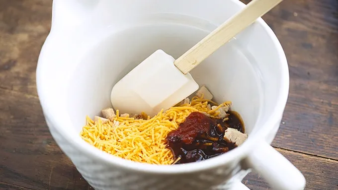 Place the chicken, cheddar cheese, barbecue sauce, and 1 tablespoon of sriracha in a medium mixing bowl and stir to combine.
