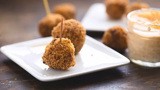 Deep-fried cheesy chicken balls seasoned with spicy barbecue sauce!