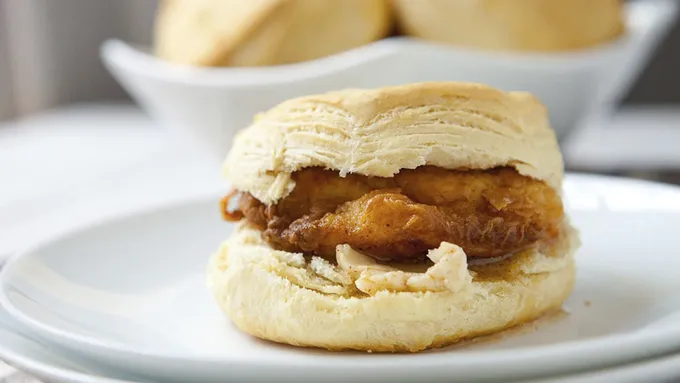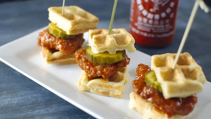 - Build these little waffle and sriracha chicken sliders as party appetizers or late-night snacks. People can’t get enough of the chicken and waffle craze, and this tasty app is a great way to class up the dish and serve it at a party. The best part of this chicken and waffle sandwich is the sriracha buffalo sauce. It's a new twist on the classic buffalo, and adds a real kick to the sandwich! There's also maple in the sauce to pair with the waffle. Pop a pickle on top and you have a perfect two-bite appetizer that can be served anywhere from the next big game to the most elegant event. So good – crunchy, chewy, sweet, salty, and spicy!