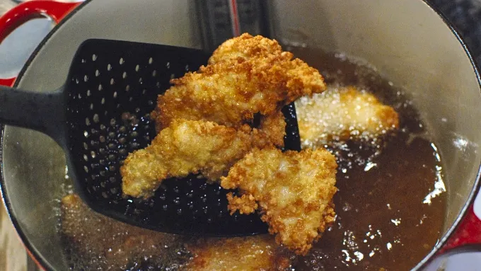 Step2Slice the chicken against the grain on a bias to create small round tenders. Place the flour into one bowl, the eggs into the next, and the breadcrumbs into a third. Bread the chicken by lightly coating in flour, then dipping into the eggs, followed by the breadcrumbs. Fry at 350°F for about 5 minutes until cooked and brown.