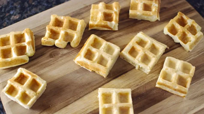 Step1Mix the Bisquick™, milk, oil, and egg. Make into waffles. Allow to cool and cut into 24 squares.