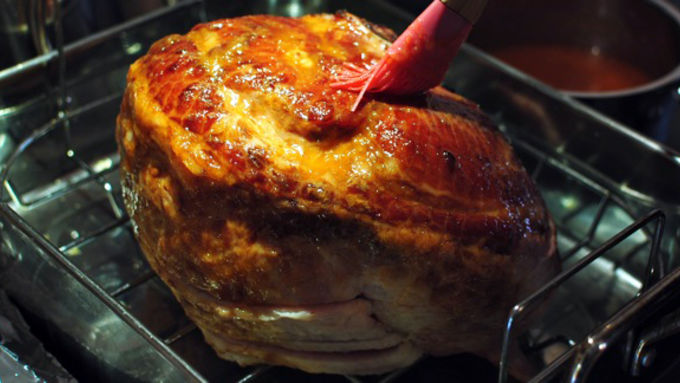 Step2Place the ham in a large roasting pan and brush the glaze over the skin. Tent with foil and and cook the ham until it's warmed all the way through, 2 and 1/2 hours, glazing every half hour.