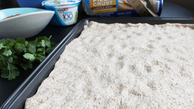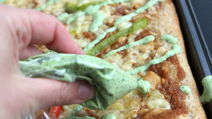 Step6While the pizza cooks, combine 1/2 cup cilantro with yogurt in a food processor. Salt to taste. For extra flavor, squeeze a half a lime into the mixture. Transfer to a zip top bag. When the pizza is finished, drizzle cilantro-yogurt sauce over pizza.
