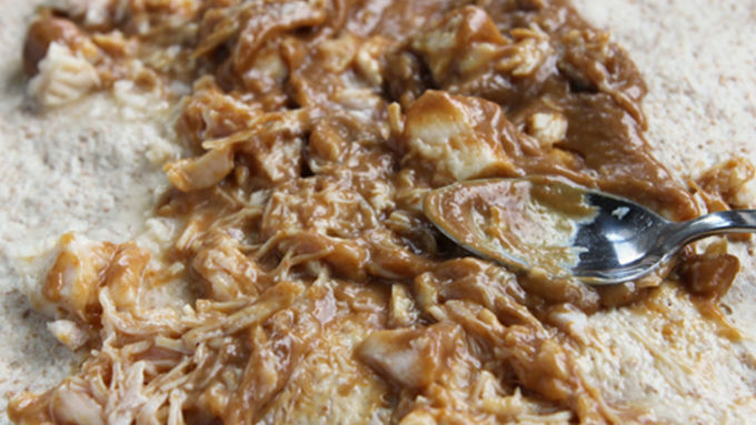 Step3Mix peanut sauce, chicken, and garlic together. Spread over pizza crust.