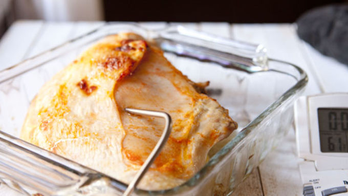 Step5Remove breast and insert a meat thermometer into the thickest part of the breast. Turn oven temperature down to 350°F.