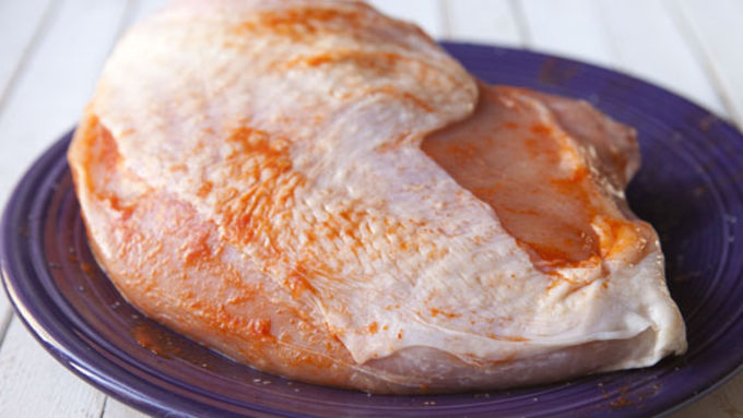 Step1Rub turkey breast well with sriracha and salt. Work the hot sauce under the skin of the breast and and into any cuts in the breast as well. It should be completely rubbed with chili sauce and salt.