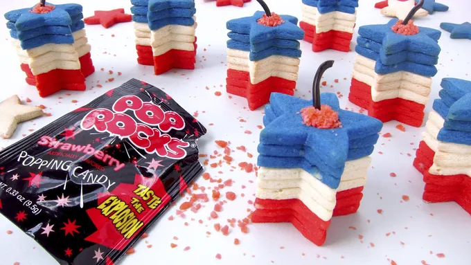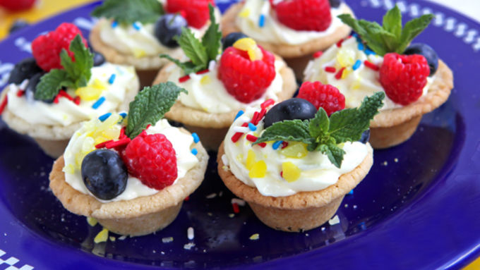 - Oh, say can you see ... these adorable fruity cookie bites? These little baby Star-Spangled Cookie Bites of goodness are all you're gonna want in your mouth all month long. A cross between a cookie and a pie, these beautiful little cookie cups are filled with Lemon Drop-flavored Greek yogurt mousse. Yep. We just said that. LEMON DROP FLAVORED GREEK YOGURT MOUSSE. Roll it around in your mouth, cutie pie. Because it's about to get all sorts of summery up in here. The secret to the lemon flavor are Lemon Drops! Look for lemon drops in the candy section of most grocers and drugstores. They shouldn't be too hard to find! Once your cookie cups are cooked, and completely cooled, fill them with your lemony mousse mixture, and decorate with fresh berries and crushed lemon drops. Put your hand over your heart and just stand back and reflect on them for a moment. All hail happiness. Happy Star Spangling!