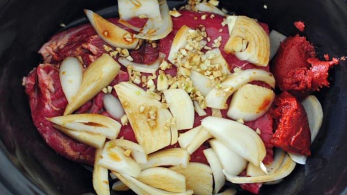 Step1In a slow cooker, place the flank steak, tomato paste, diced onions, garlic, Worcestershire sauce, soy sauce, lime juice and the pinch of salt. Cook on high for 3.5 hours.