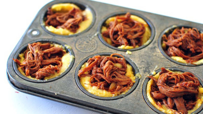 Mini cornbread cups with shredded seasoned steak nestled inside.