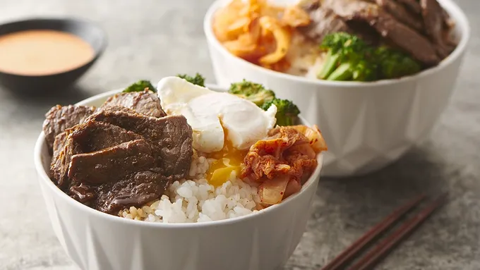 Divide rice among 6 serving bowls; top with bean mixture, steak and Toppings.