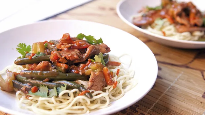 A little bit stir-fry and a little bit spaghetti with red sauce, this fiery fusion dinner has it all!