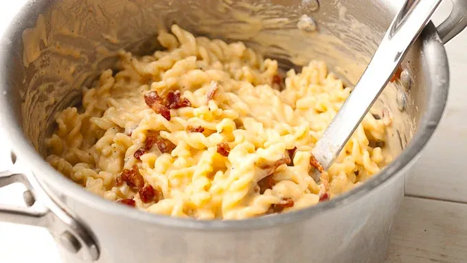 Step4Stir in cooked pasta and most of the reserved crispy bacon. Season with salt and pepper.![]()