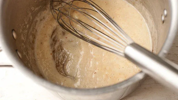 Step2Wipe out pot and add chopped bacon to pot over low heat. Let bacon render out until the pieces are very crispy. Remove crispy bacon from pot with a slotted spoon. Add flour and whisk into bacon grease. Let cook on low for a few minutes to form a roux (should be a light tan color).![]()