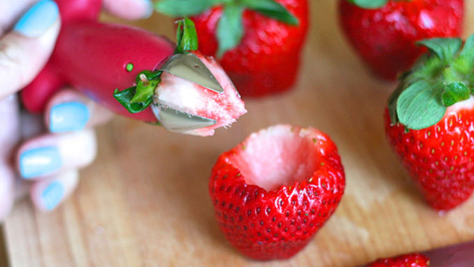 To turn the strawberry into an edible shot glass. Shave a tiny bit from the bottoms of the strawberries. Be careful that you don’t take too much off ... just enough to allow them to stand upright. Then, hollow out the strawberries. If you have a handy dandy strawberry huller go ahead and use it, but a paring knife or grapefruit spoon would work too.