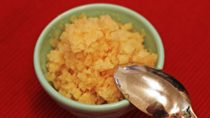 Remove from freezer and scrape frozen mixture with the teeth of a fork until a crystallized slush mixture forms. Scoop into glasses and serve.