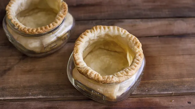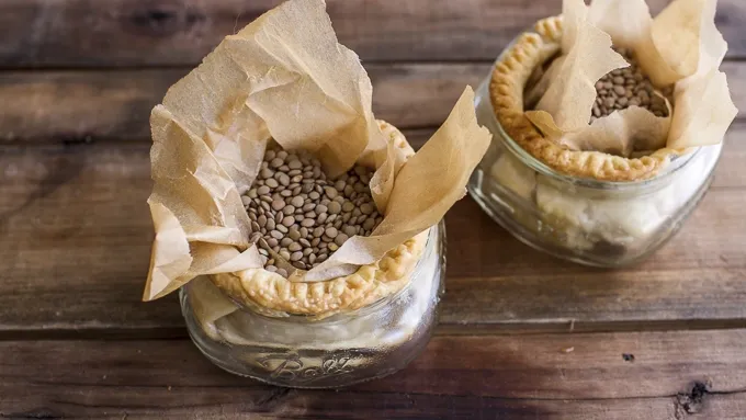 Step4Place a piece of parchment paper in each jar to cover the dough. Add pie weights or dried beans on top of the parchment and bake for 10-12 minutes or until the crust is golden brown.
