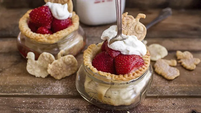 - There’s just something about mini foods that gets me every single time. I guess that technically, these may not be considered mini. Maybe more like individual. But to me that just means instead of having one I get to have two, because everyone knows a mini serving is just an excuse for seconds. It’s why we love mini foods so much. Logical, right? So, apparently strawberry pie is one of the top three Thanksgiving pies (number two, behind apple). Who would have thought? I guess you can’t deny it, strawberry pie IS pretty delicious. Especially when served in half-pint-sized canning jars with cute little cinnamon sugar pie-crust cookies. Love it!