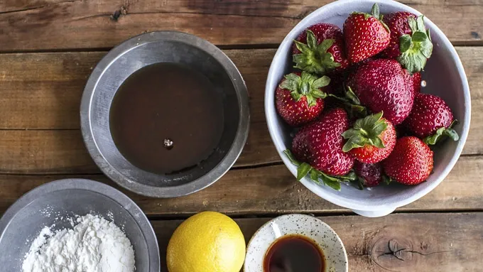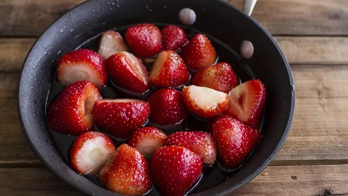 Step6Meanwhile, add 1 pound of strawberries, the maple syrup, brown sugar and vanilla to a saucepan. Bring the sauce to a boil and simmer 8-10 minutes.