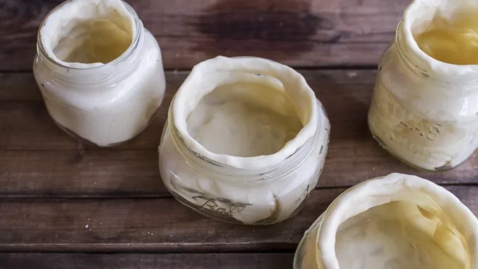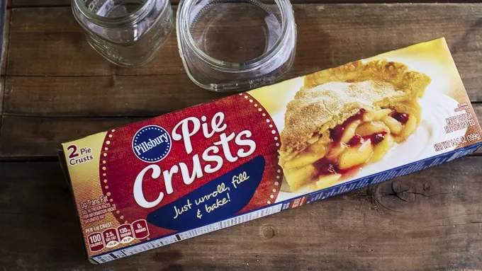 Step3Unroll your pie crusts and lay them on a clean surface. Use a knife to cut out four 6-inch circles. Carefully press the dough into the bottom of the jars and up the sides.