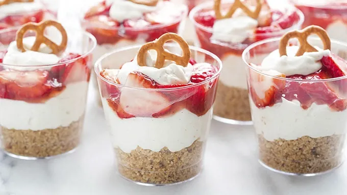 Step5Spoon prepared strawberry layer on top of each cup. Finish with a dollop of yogurt mixture. Garnish with a pretzel before serving. Serve chilled.