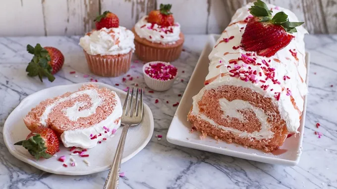 This easy strawberry roll cake is as perfect for Valentine's Day as it is for a summer soiree.