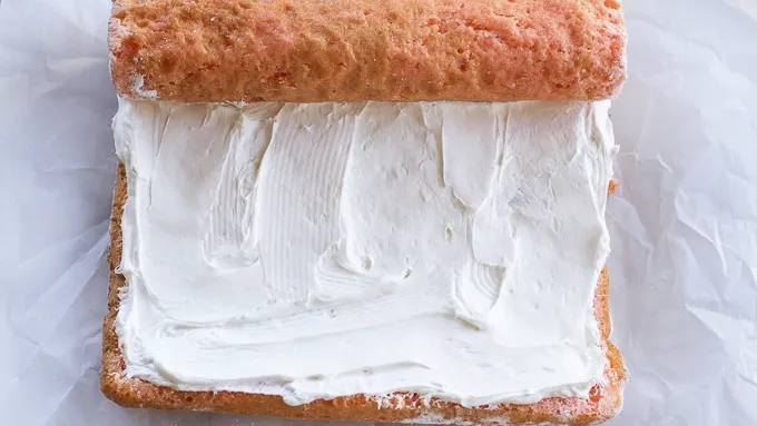 Step4Unroll cake carefully, and remove towel. Allow the end to remain slightly curled. Spread 1 container of frosting evenly over the surface of the cake. Re-roll the filled cake, wrap in plastic wrap and refrigerate 30 minutes.