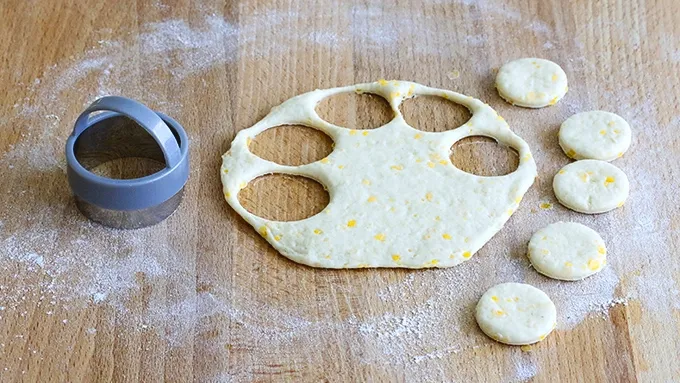 Step2Lightly flour a work surface and roll out a biscuit into a 5-inch circle. Use a 1 1/2 inch biscuit cutter and cut out 7 circles from each biscuit.