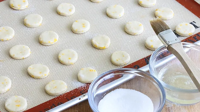 Step4Brush each biscuit round with egg white and sprinkle with sugar. Bake for 10-13 minutes or until very lightly golden. Let cool completely.