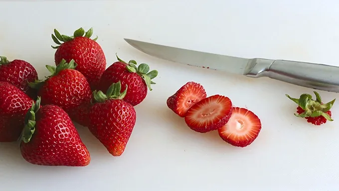 Step5While the biscuits are baking, slice the strawberries about 1/4-inch thick.