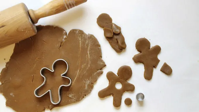 Step2Roll the dough out on a floured surface to 1/4-inch thickness. Cut out your shapes and place them on a baking tray lined with parchment paper. Use a 1/2-inch circle cutter or a knife to make holes, bite marks or to cut off limbs. Or, pose the cookies by gently bending their limbs.