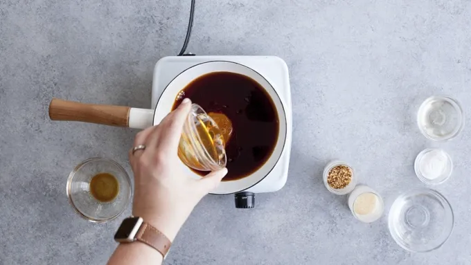 Whisk together the water and cornstarch, and add it to the boiling soy sauce mixture. Simmer until just thickened, about 2 minutes. Remove from heat, and set aside.