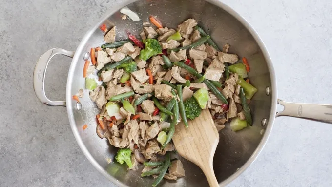 Remove from heat, and pour the sauce over the veggies and chicken. Toss to coat.