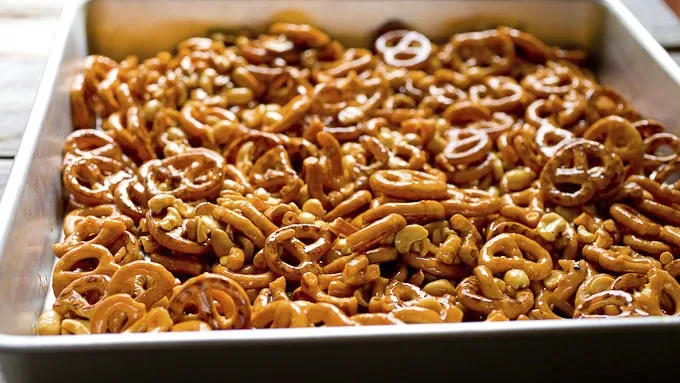 Step2Add pretzels and nuts to the bowl and toss with butter mixture until evenly coated.