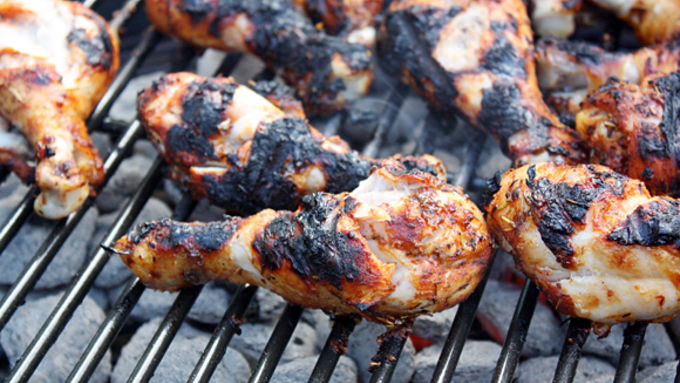 Step4Remove chicken from oven and place on a hot charcoal or gas grill (or 425°F oven) and grill, turning once, until hot and charred, about 10 minutes.