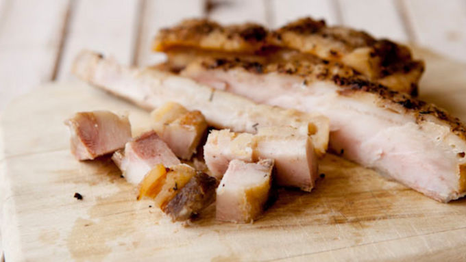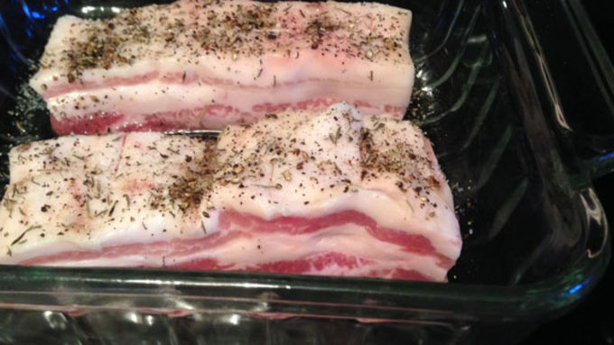 Step2Roast pork belly covered with foil for two hours, then remove foil and roast for another two hours. Remove belly from the oven, let cool, and store overnight in refrigerator until needed.