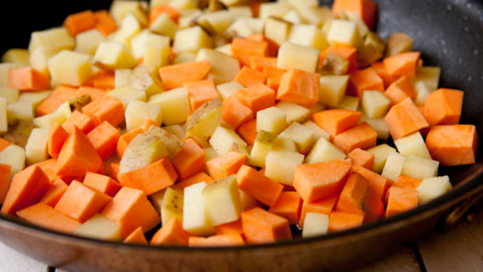 Step5Add the cubed sweet potatoes and Yukon gold potatoes to the skillet with the fat and let cook, over medium heat, until they start to brown on all sides, another 10-12 minutes.