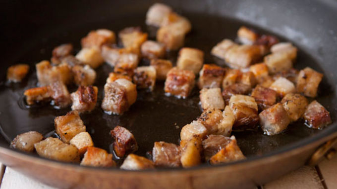Step4Add pork belly to a large skillet over medium heat and cook until pieces are crispy, about 10 minutes. Remove belly from the skillet. There should be a few tablespoons of rendered fat in the skillet. Leave it!