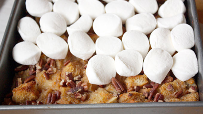 Step5Sprinkle half of toasted pecans on bread pudding. Cut marshmallows in half width-wise and place, cut side down, on top of bread pudding. Sprinkle with remaining toasted pecans.