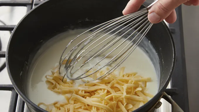 Step7Strain sauce through a strainer into a separate large saucepan. Whisk in shredded gouda cheese and cook over low heat, whisking constantly, until cheese melts and sauce is smooth and thick. Season to taste with salt and pepper.![]()