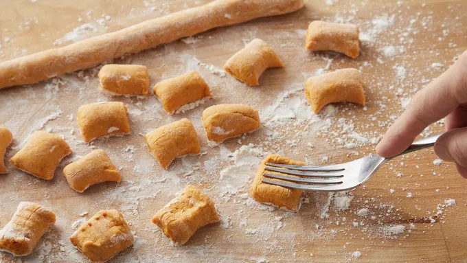 Step3Remove dough ropes from fridge and cut each into 1-inch pieces; separate slightly. Using a floured fork, made a very slight indent in each piece to create ridges (or, roll each piece lightly over the fork tines).![]()