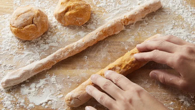 Step2Transfer dough to a well-floured surface, roll into a ball and flatten. Divide into 8 equal pieces and roll each piece into a long rope about 1/2-inch thick. Place each rope on a floured baking sheet or plate and refrigerate for 30 minutes.![]()