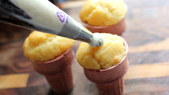 Step1Heat oven to 350°F (325°F for dark or nonstick pans). Place 24 cake ice cream cones into two mini-muffin tins. (This will keep them upright while baking).