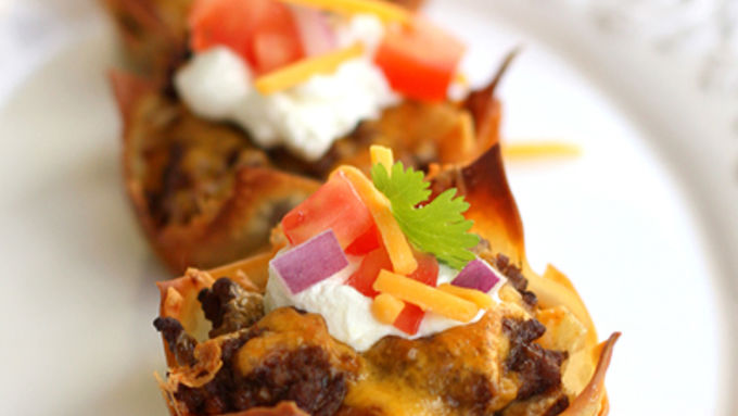 Yummy layers of your favorite taco fillings baked in wonton wrappers in cupcake form.