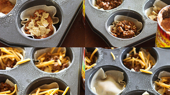 Step3Place one wonton wrapper in the bottom of each muffin cup. Layer about 1 tablespoon of refried beans on top of each wonton. Crush one tortilla chip on top of the beans. Top with 1 tablespoon of taco meat and 1 tablespoon of shredded cheese. Repeat the layers again with a wonton wrapper, refried beans, tortilla chips, taco meat and cheese.