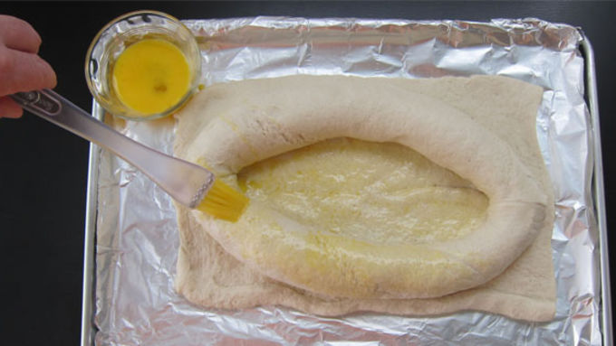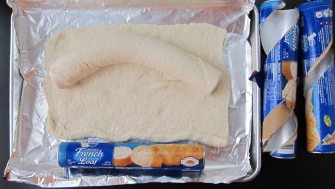 Unroll one can of bread dough onto a non-stick tin foil lined or parchment paper-lined baking sheet.
