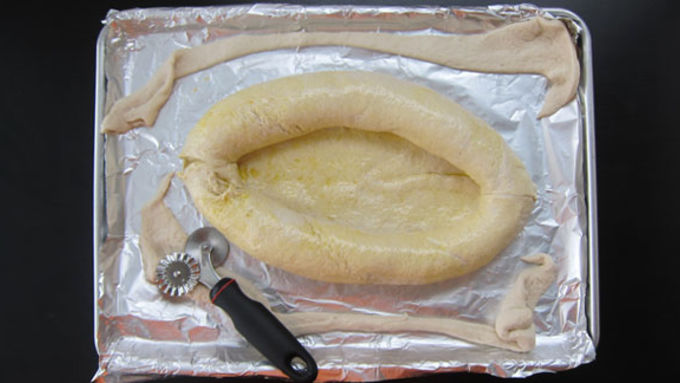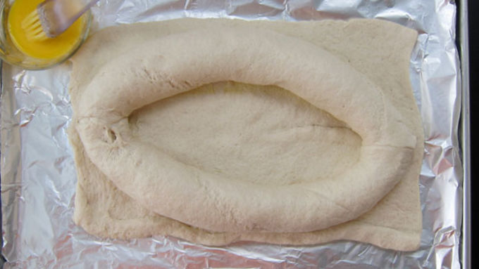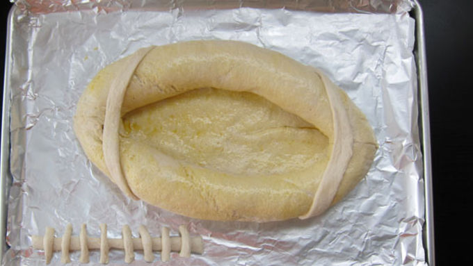 Set another roll of bread, on top of the unrolled dough, forming one side of a football.
